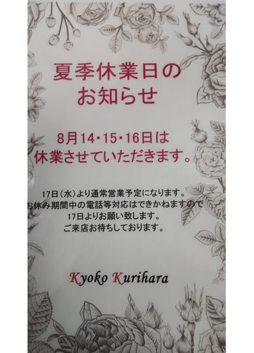 8月の14.15.16日と夏季休業とさせていただきます。この期間でのお電話対応等お受けできませんので、ご理解の程よろしくおねがいします🙇